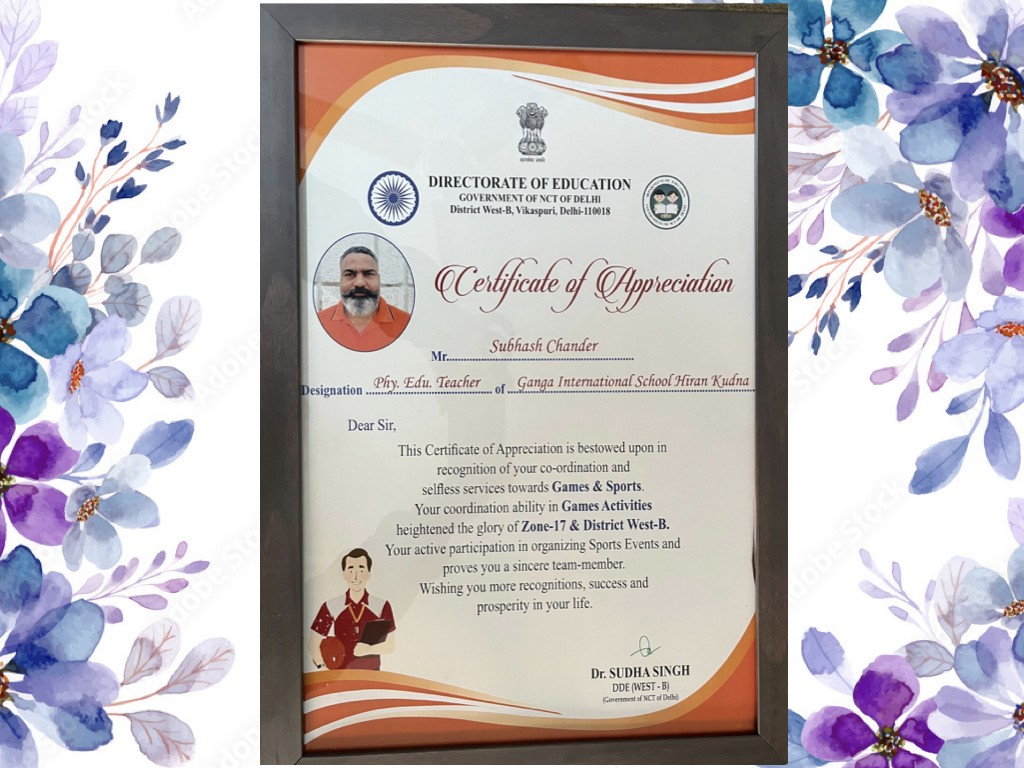 We are delighted to share that Mr. Subash Chander, Physical Education Teacher, has been honored by the Directorate of Education, Govt. of NCT of Delhi for his outstanding coordination and selfless contribution towards Games & Sports. ๐